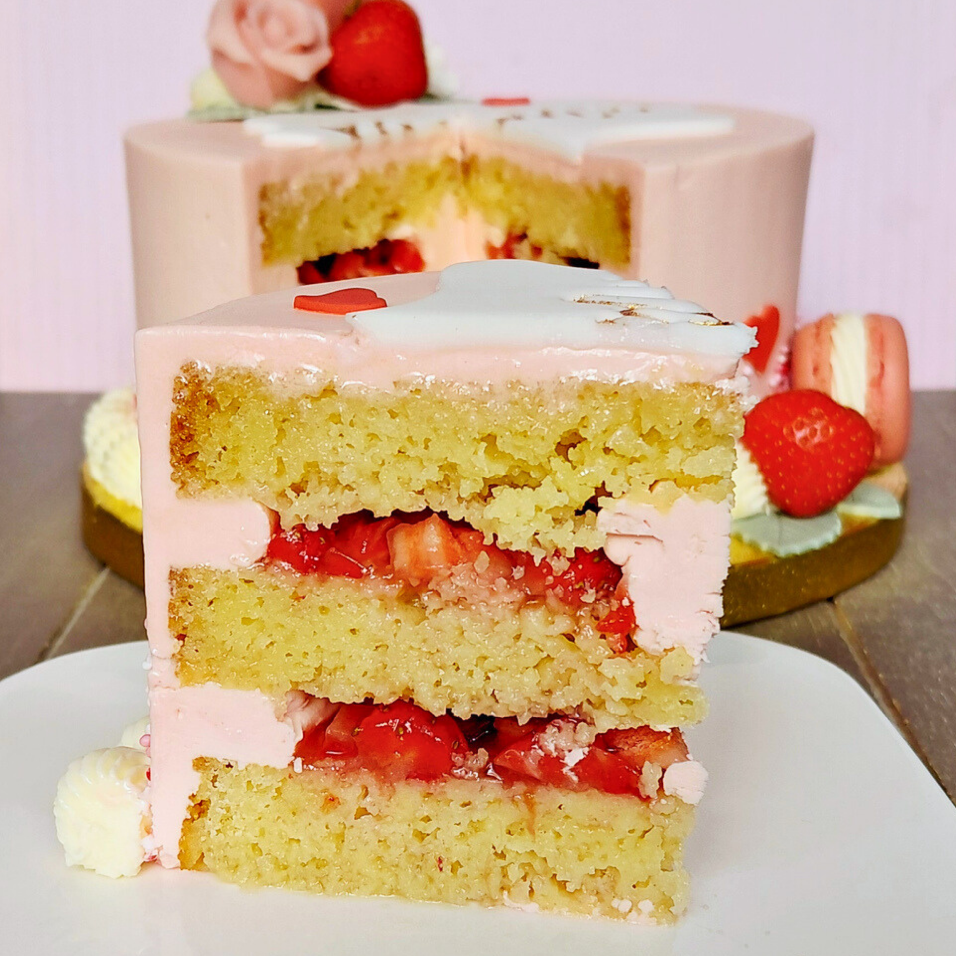 Een zachte, smeuïge vanillecake gevuld met verse aardbeien en een romige aardbeien buttercream. Fris, licht en perfect in balans.